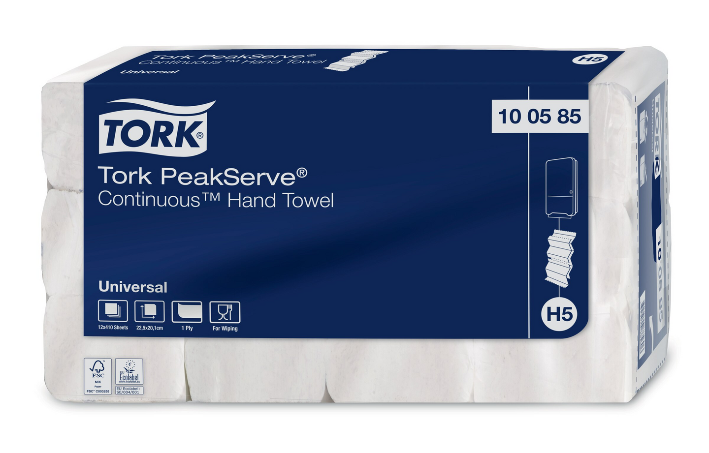 Tork PeakServe®: uusin innovaatio, joka on suunniteltu vilkkaisiin saniteettitiloihin, joissa henkilöstön on maksimoitava siivousaika ja tehtävä tiloissa käyminen sujuvaksi kävijöille. Järjestelmä sopii käytettäväksi Tork PeakServe® Continuous™ käsipyyhkeiden kanssa. Sen kapasiteetti on erittäin suuri: 2 100 pyyhettä, jotka järjestelmä annostelee nopeasti ja keskeytyksettä. Annostelijan uudelleentäyttäminen tiiviiksi puristetuilla täyttöpakkauksilla käy nopeasti ja onnistuu milloin tahansa. Täyttöpakkauksien säilyttäminen ja kuljettaminen on helppoa, ja näin henkilöstö voi keskittyä täyttämisen sijaan siivoukseen.