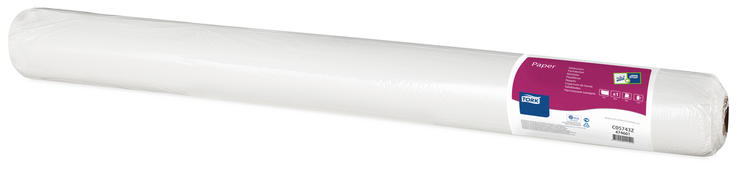 Tork kohokuvioitu paperinen valkoinen pöytäliinarulla suojaa pöydän pintaa ja antaa ravintolalle siistin ilmeen. Taloudellinen vaihtoehto pöytien kattaukseen.