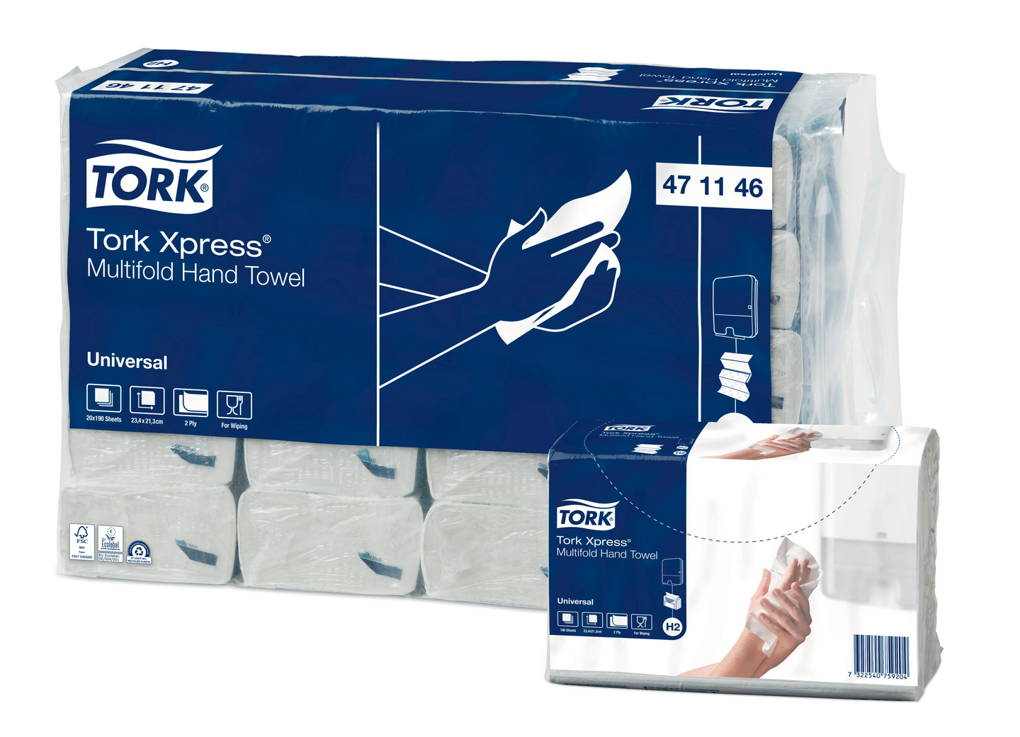 Tork Xpress Multifold Universal laatuinen käsipyyhe täyttää käsien kuivaamisen perustarpeet ja antaa rahoillesi kunnon vastinetta. Nämä pyyhkeet sopivat Tork Xpress® annostelijaan Multifold käsipyyhkeelle saniteettitiloihin, joissa on kohtalaisesti kävijöitä. Se sopii pieniin tiloihin ja tarjoaa asiakkaillesi sekä mukavuutta että hygieniaa. Ainutlaatuinen Tork Polypack pakkaus toimii myös annostelijana ja suojaa käsipapereita roiskeita.
