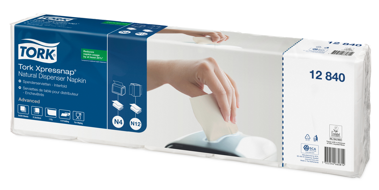 Tork Xpressnap® lautasliina-annostelijat sopivat täydellisesti itsepalveluravintoloihin. Järjestelmä vähentää lautasliinojen kulutusta 25 % perinteisiin lautasliina-annostelijoihin verrattuna. 1-kerroksiset Tork Xpressnap® valkaisemattomat annostelijaliinat on valmistettu 100-prosenttisesta kierrätyskuidusta. Ne ovat täydellinen valinta, jos haluat osoittaa välittäväsi ympäristöstä.