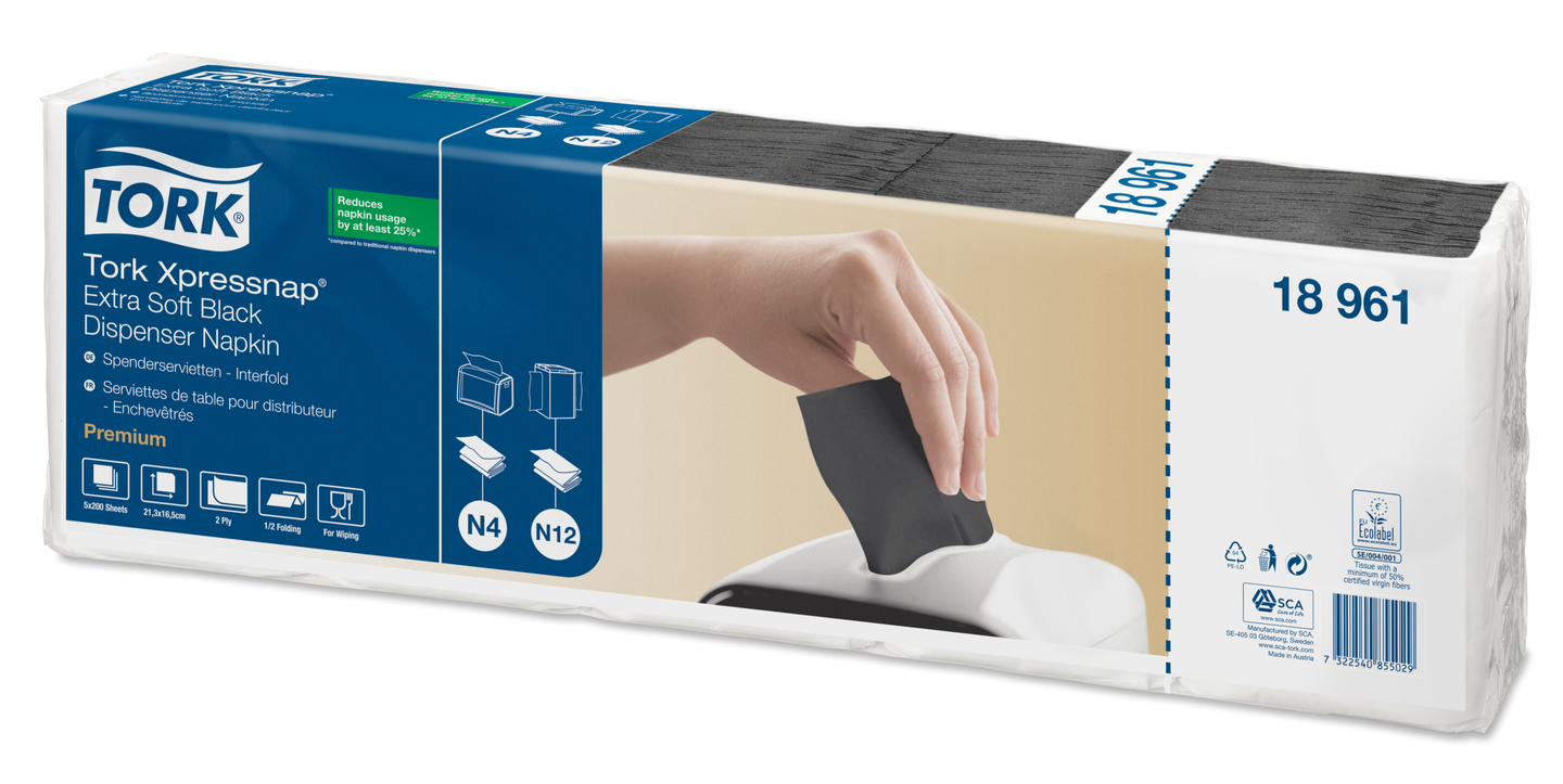 Tork Xpressnap® lautasliina-annostelijat sopivat täydellisesti itsepalveluravintoloihin. Järjestelmä vähentää lautasliinojen kulutusta 25 % perinteisiin lautasliina-annostelijoihin verrattuna. Musta 2-kerroksinen ja pehmeä Tork Xpressnap® annostelijaliina on ihanteellinen yrityksille, jotka kaipaavat käteviä ratkaisuja ja haluavat antaa laadukkaan vaikutelman.