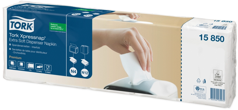 Tork Xpressnap® lautasliina-annostelijat sopivat täydellisesti itsepalveluravintoloihin. Järjestelmä auttaa vähentämään lautasliinojen kulutusta 25 % perinteisiin lautasliina-annostelijoihin verrattuna. Valkoiset, 2-kerroksiset ja erikoispehmeät Tork Xpressnap® annostelijaliinat ovat ihanteellisia yrityksille, jotka kaipaavat käteviä ratkaisuja ja haluavat antaa laadukkaan vaikutelman suuren, erikoisvahvan lautasliinan avulla. Kiinnitä käyttäjien huomio omalla asiakaspainatuksella - tutkitusti 75 % lautasliinoja käyttävistä lukee viestin.