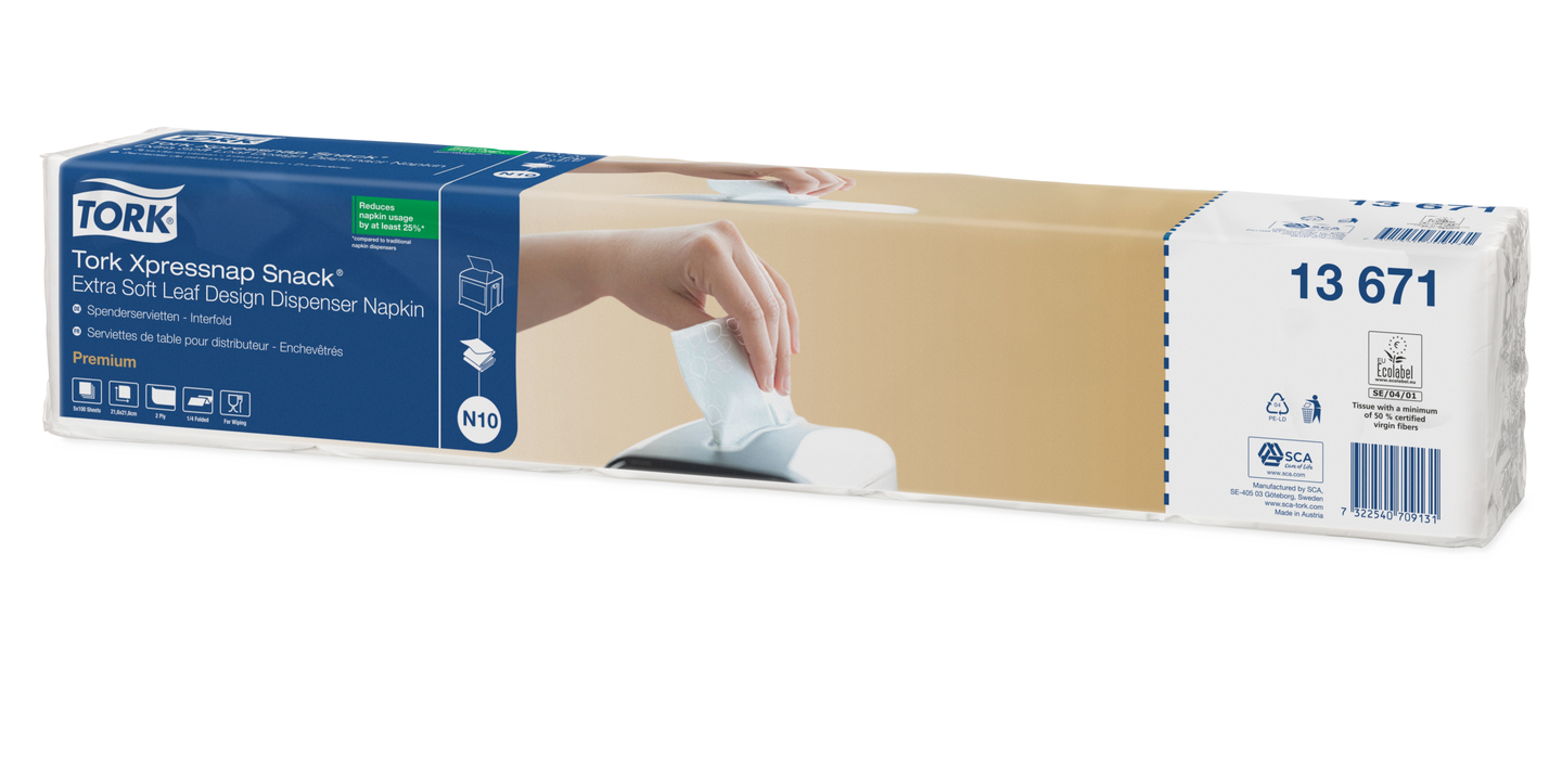 Tork Xpressnap Snack® lautasliina-annostelijat on suunniteltu itsepalveluravintoloille, joissa pieni lautasliina riittää. Järjestelmä auttaa vähentämään lautasliinojen kulutusta 25 prosentin verran perinteisiin lautasliina-annostelijoihin verrattuna. Lehtikuvioidut, 2-kerroksiset ja erikoispehmeät Tork Xpressnap Snack® annostelijaliinat ovat ihanteellisia yrityksille, jotka kaipaavat käteviä ratkaisuja ja haluavat antaa laadukkaan vaikutelman vahvan ja tyylikkäästi kuvioidun lautasliinan avulla.