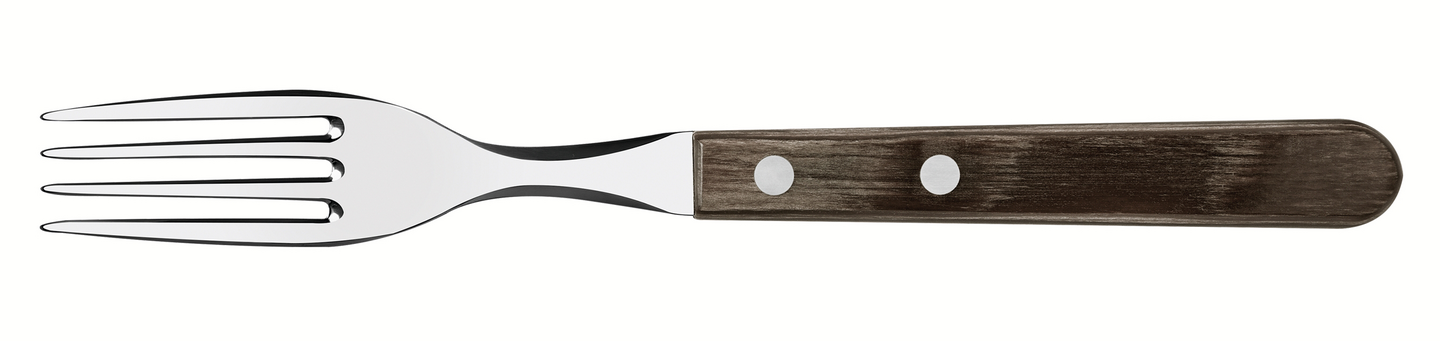 Tyylikäs puukahvainen haarukka, joka kestää konepesua. Kahvassa käytettävä Polywood on komposiittimateriaali, joka koostuu puuviiluista ja hartsista. Viilut pinotaan päällekkäin ja kyllästetään hartsilla, jonka jälkeen ne puristetaan tiiviisti yhteen ja hartsi kovetetaan lämmittämällä. Tällä menetelmällä puun luonnollinen ulkonäkö pystytään säilyttämään samalla kun jokainen viilu peitetään polymeerimateriaalilla, joka suojaa puuta kosteudelta ja mikrobeilta, ja tekee tuotteesta konepesun kestävän. Polywood-materiaali valmistetaan FSC-sertifioidusta männystä, metalliosat ovat ruostumatonta terästä.