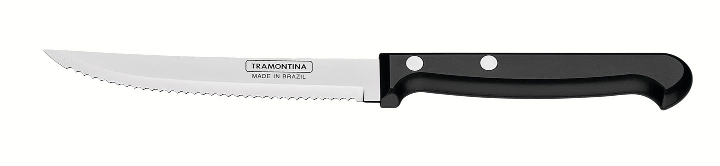 Ruostumattomasta teräksestä (AISI 420) valmistettu, konepesun kestävä, laadukas pihvi/hedelmäveitsi soveltuu täydellisesti kypsän lihan ja hedelmien leikkaamiseen. Veitsen sahalaitainen terä tekee leikkaamisesta vaivatonta ja pitää veitsen terävänä pidempään. Tramontinan Ultracorte-sarjan pihviveitsissä on antibakteerinen ja ergonominen kahden alumiininastan kahva, joka on valmistettu kestävästä polypropeenista.