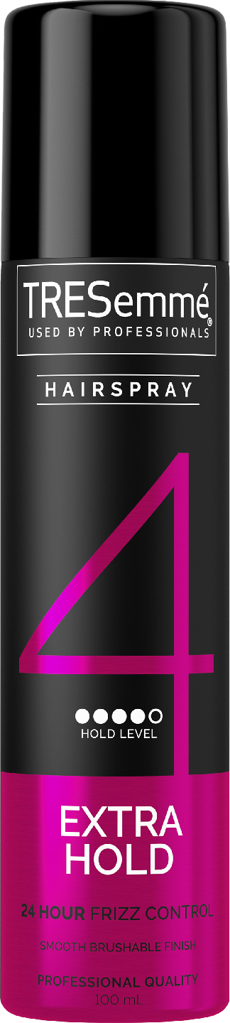 TRESemmé Extra Hold hiuskiinteen avulla viimeistelet kampauksesi kuin ammattilainen. TRESemmé Extra Hold tarjoaa salonkitason viimeistelyä hiuksillesi kätevässä 100 ml matkapakkauskoossa. Extra Hold on hiuskiinne, joka kuivuu nopeasti ja antaa kampauksellesi pitoa, joka kestää joka kahden vuorokauden ajan. Tämä hiuslakka pitää lentelevät irtohiukset kurissa ja varmistaa parhaan mahdollisen, mutta kuitenkin joustavan pidon. Nauti helposti hallittavasta kampauksesta, joka pysyy upeana joka säässä, sillä hiuskiinne suojaa kampaustasi myös kosteudelta.