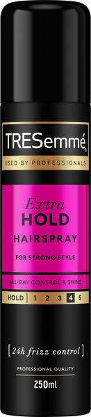 TRESemmé Extra Hold hiuskiinteen avulla viimeistelet kampauksesi kuin ammattilainen. TRESemmé Extra Hold tarjoaa salonkitason viimeistelyä hiuksillesi kätevässä 100 ml matkapakkauskoossa. Extra Hold on hiuskiinne, joka kuivuu nopeasti ja antaa kampauksellesi pitoa, joka kestää joka kahden vuorokauden ajan. Tämä hiuslakka pitää lentelevät irtohiukset kurissa ja varmistaa parhaan mahdollisen, mutta kuitenkin joustavan pidon. Nauti helposti hallittavasta kampauksesta, joka pysyy upeana joka säässä, sillä hiuskiinne suojaa kampaustasi myös kosteudelta.