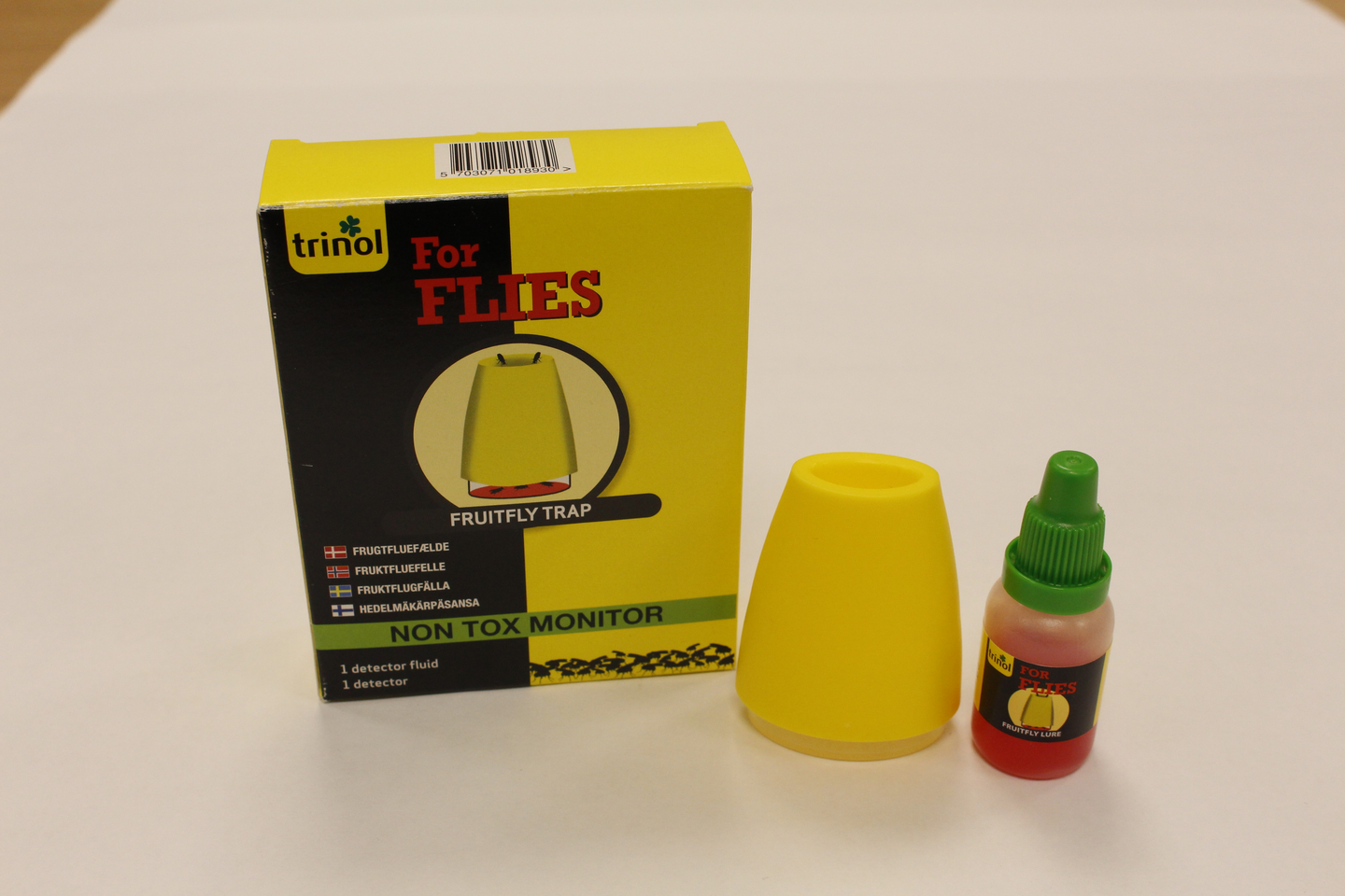 Trinol Hedelmäkärpäsansa lentävien hyönteisten torjuntaan. Hedelmäkärpäsansa on helppokäyttöinen, nestemäistä houkutinainetta sisältävä hyönteisansa. Käyttöohje: Pullossa oleva neste kaadetaan ansaan päältä. Ansan houkutinaine houkuttelee kärpäset ansassa olevaan suppiloon, josta ne eivät pääse pois. Ansa sijoitetaan paikkaan, missä hyönteisiä esiintyy, esimerkiksi keittiöön tai olohuoneeseen. Houkutinaine vaikuttaa noin kuukauden ajan tai kunnes aine on haihtunut. Ainetta on lisättävä tarvittaessa. Säilytys: Varastoidaan 0-40°C:ssa. Ei lasten ulottuville. Vaikuttavat aineet: luonnolliset elintarvikkeiden ainesosat. Pakkauksen sisältö: 1 kpl kärpäsansa, 1 kpl houkutinainepullo.