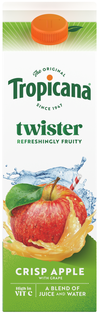 Tropicanan raikas maku, nyt luonnollisesti kevyempänä. Nauti taidokkaasti valmistetusta sekoitetusta puristetusta omenamehusta, rypälemehusta ja vedestä, joka tarjoaa raikkaan ja kirkkaan maun 30 % vähemmällä sokerilla luonnollisesti. Ja 100 % päivittäisestä C-vitamiinistasi, Tropicana Twister on paras tapa aloittaa päivä raikkaasti.