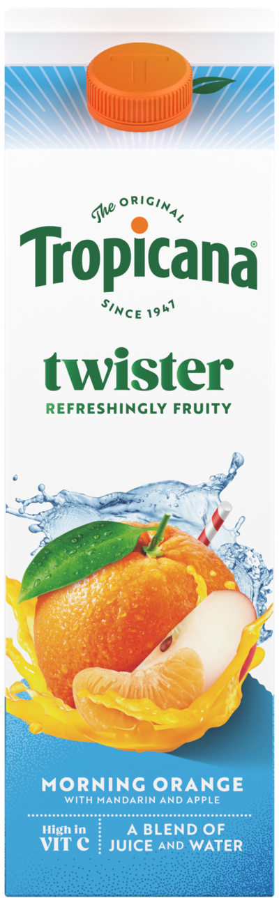Tropicanan raikas maku, nyt luonnollisesti kevyempänä. Nauti taidokkaasti valmistetusta sekoituksesta brasilialaista appelsiinia, mandariinia, omenaa, rypälemehua ja päärynämehua veden kanssa, joka tarjoaa raikkaan ja pirteän maun 30 % vähemmällä sokerilla luonnollisesti. Ja 100 % päivittäisestä C-vitamiinistasi, Tropicana Twister on paras tapa aloittaa päivä raikkaasti.