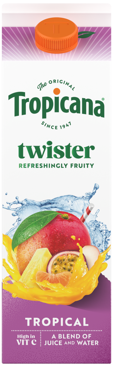 Tropicanan raikas maku, nyt luonnollisesti kevyempänä. Nauti taidokkaasti valmistetusta trooppisten hedelmien sekoituksesta, johon kuuluu ananas, mandariini, omena, mango, passionhedelmä ja vesi, joka tarjoaa raikkaan ja eksoottisen maun 30 % vähemmällä sokerilla luonnollisesti. Ja 100 % päivittäisestä C-vitamiinistasi, Tropicana Twister on paras tapa aloittaa päivä raikkaasti.