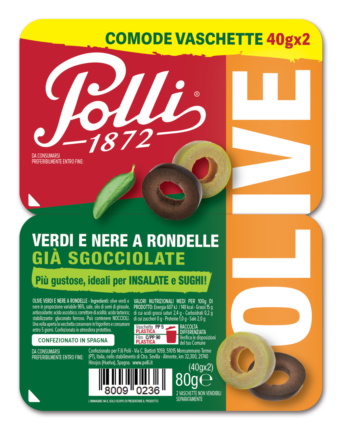 Polli viipaloidut vihreät ja mustat oliivit 2x40g