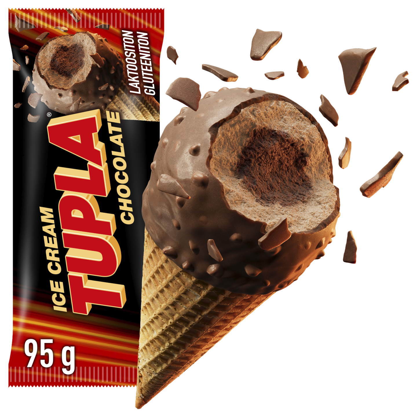 LaktoositonSuomalaisten rakastama ikoninen suklaapatukkabrändi Tupla on nyt jäätelöä. Tupla CHOCOLATE jäätelötuutissa on laktoositonta suklaakermajäätelöä, kaakaonougatkastiketta ja kuorrutuksena laktoositon suklaakuori mantelirouheella. Gluteeniton vohveli suklaanmakuisella kuorrutteella viimeistelee makuseikkailun.