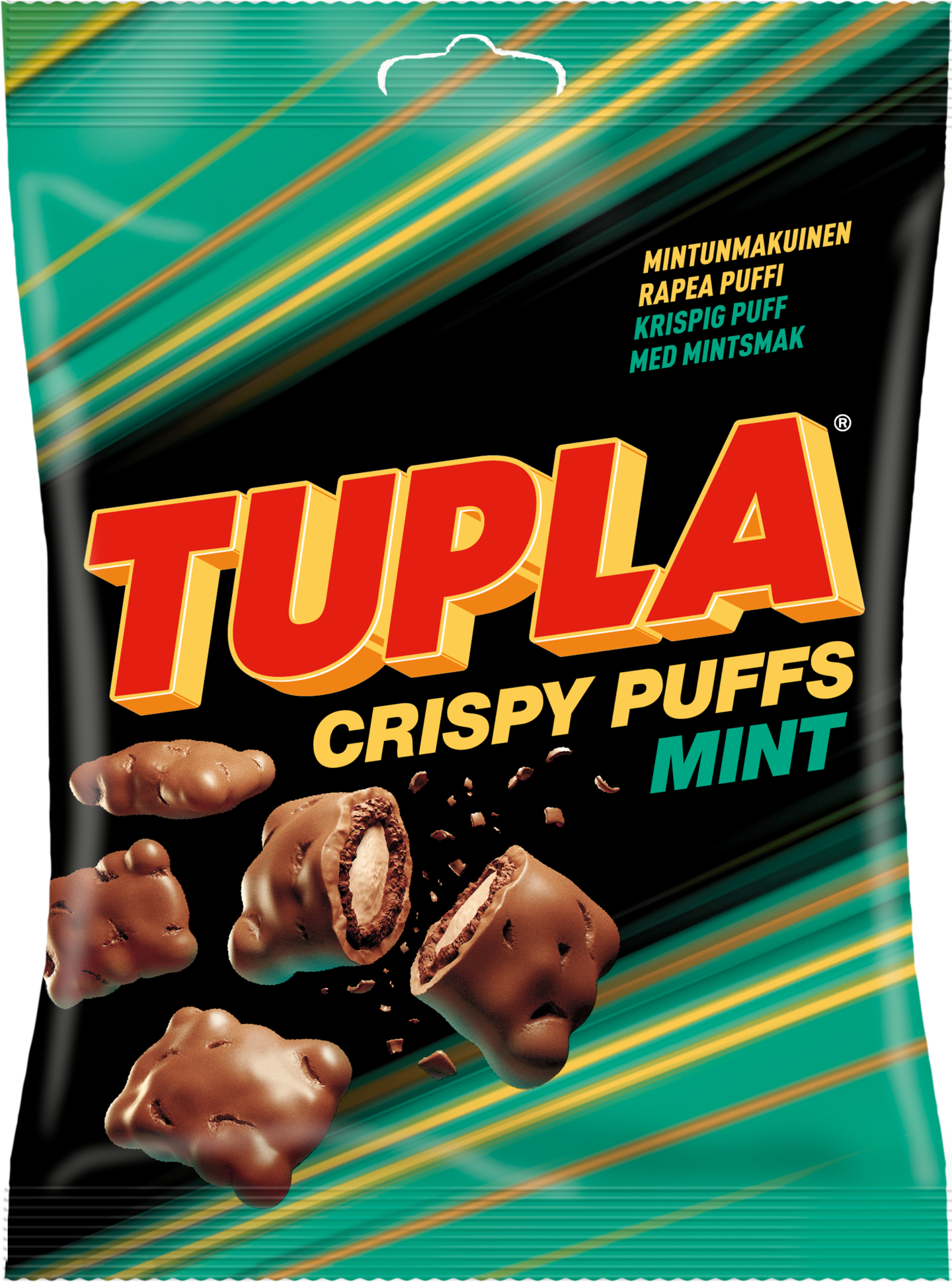 Tupla Crispy Puffs Mint -pussi sisältää rapeita ja rouheita vehnäpuffeja, joiden sisällä on Tupla-suklaapatukoista tuttua kaakaonougatia.