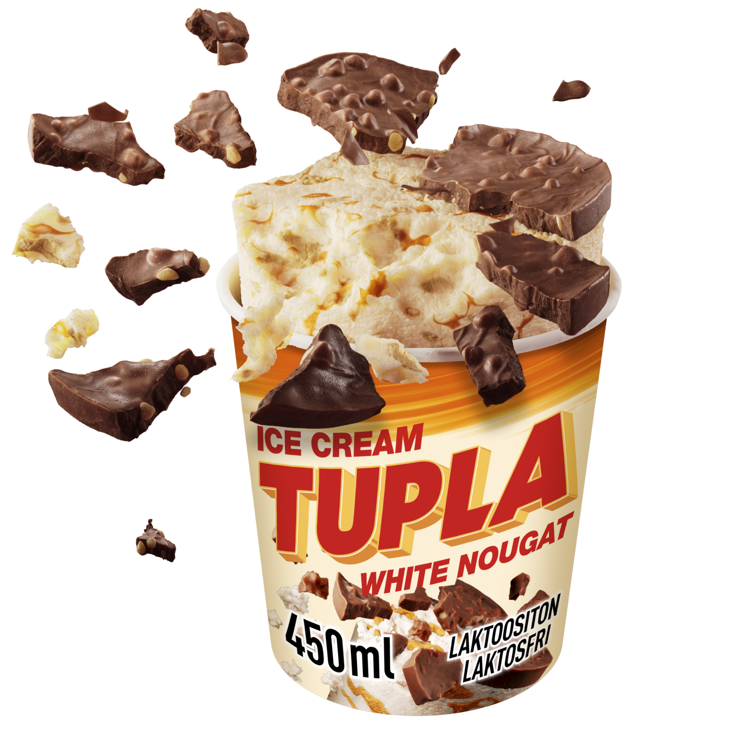 LaktoositonSuomalaisten rakastama ikoninen suklaapatukkabrändi Tupla on nyt jäätelöä. Tupla WHITE NOUGAT jäätelöpurkissa on laktoositonta kermajäätelöä, nougatkastiketta, toffeekastiketta, rouhittuja manteleita sekä kuorrutuksena laktoositon suklaakuori mantelirouheella.