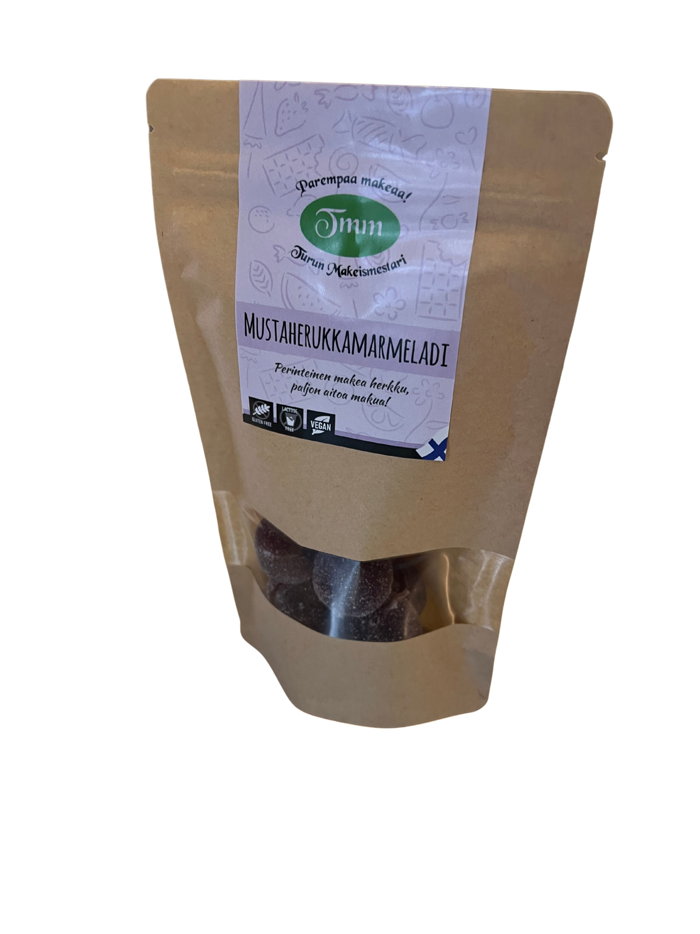 VegaaninenMustaherukan makuisia marmeladimakeisia. Perinteinen makea herkku, paljon aitoa makua!