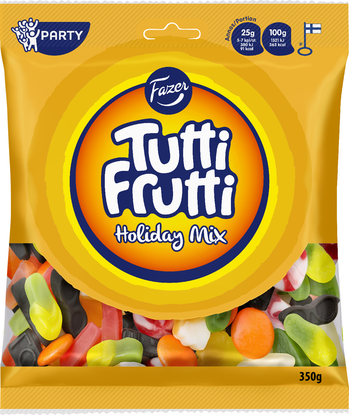 Hedelmäinen Tutti Frutti tuo iloa ja aurinkoa kaikille. Tutti Frutti Holiday Mix karkkipussi vie lomatunnelmiin ja sulkee sisäänsä yksitoista erilaista karkkia, suklaarakeista ja salmiakista eksoottisiin hedelmän makuihin. Iso karkkipussi sopii jaettavaksi isommallekin lomaseurueelle!