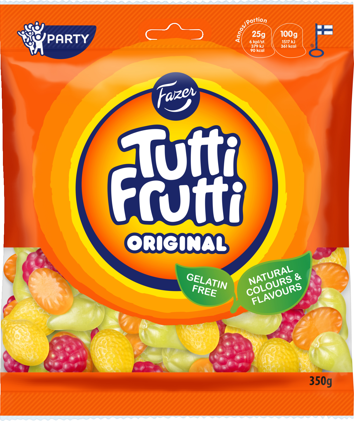 VegaaninenHedelmäinen Tutti Frutti tuo iloa ja aurinkoa kaikille. Tutti Frutti Original on pirteä sekoitus hedelmäisiä makuja: vadelmaa, päärynää, sitruunaa ja uniikkia Tutti Fruttia. Aito ja alkuperäinen hedelmäkarkki on luontaisilla väreillä valmistettu, gelatiiniton ja vegaaninen. Raikkaan makunsa se saa luontaisista aromeista. Nauti karkkipussi yksin tai yllätä ystävät!