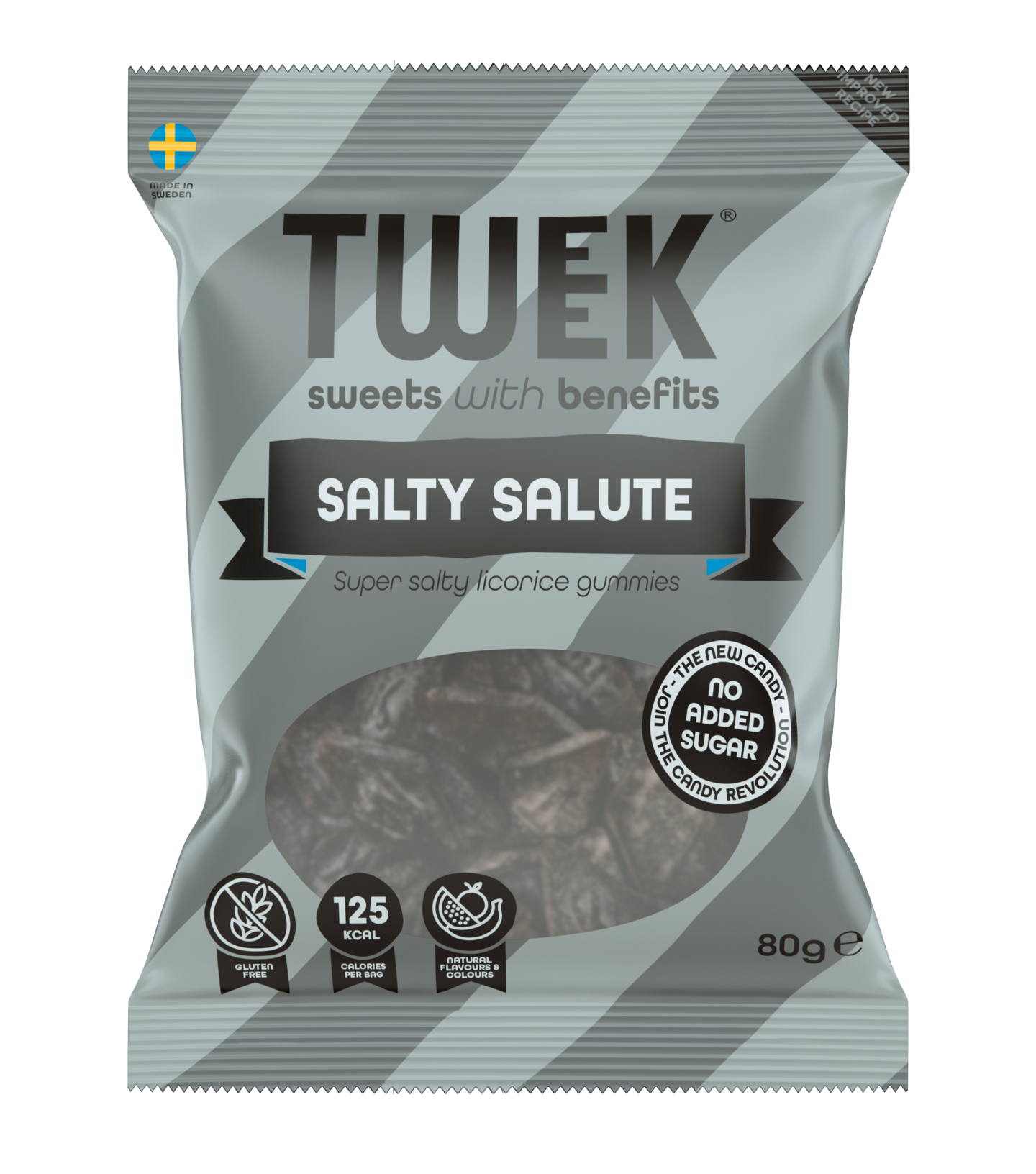 GluteenitonSuolainen lakritsisuosikki Salty Salute. Sisältää aitoa lakritsia. 95 % vähemmän sokeria, runsaskuituinen, 45 % vähemmän kaloreita, luontaisia aromeja ja värejä.