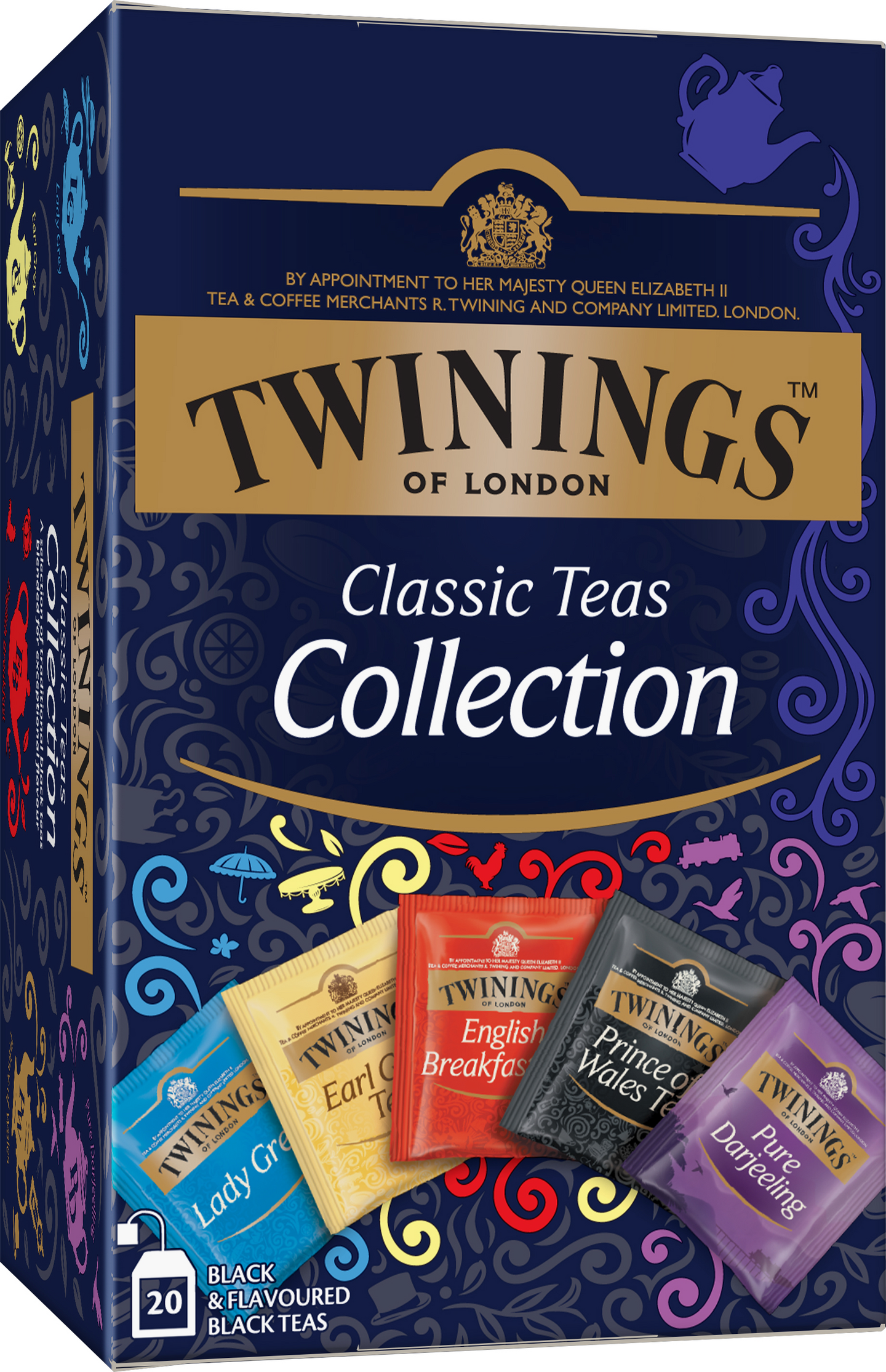 Twiningsin suosituimmat mustan teen klassikot samassa pakkauksessa: Earl Grey, Lady Grey, Prince of Wales, Pure Darjeeling ja English Breakfast.