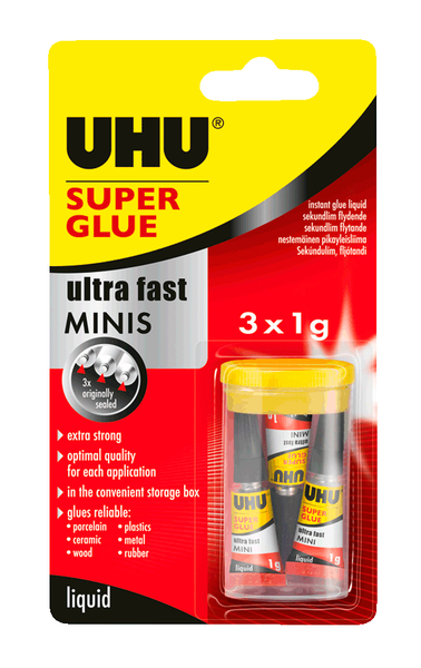 Kirkas ja valumaton pikaliima. Liitos säädettävissä hetken aikaa. Täydellinen huokoisille materiaaleille ja vertikaaliseen liimaamiseen. Kätevä kolmen pienen tuubin pakkaus - vaikka yksi tuubi kuivuisi kiinni, on aina tuore tuubi käsillä.