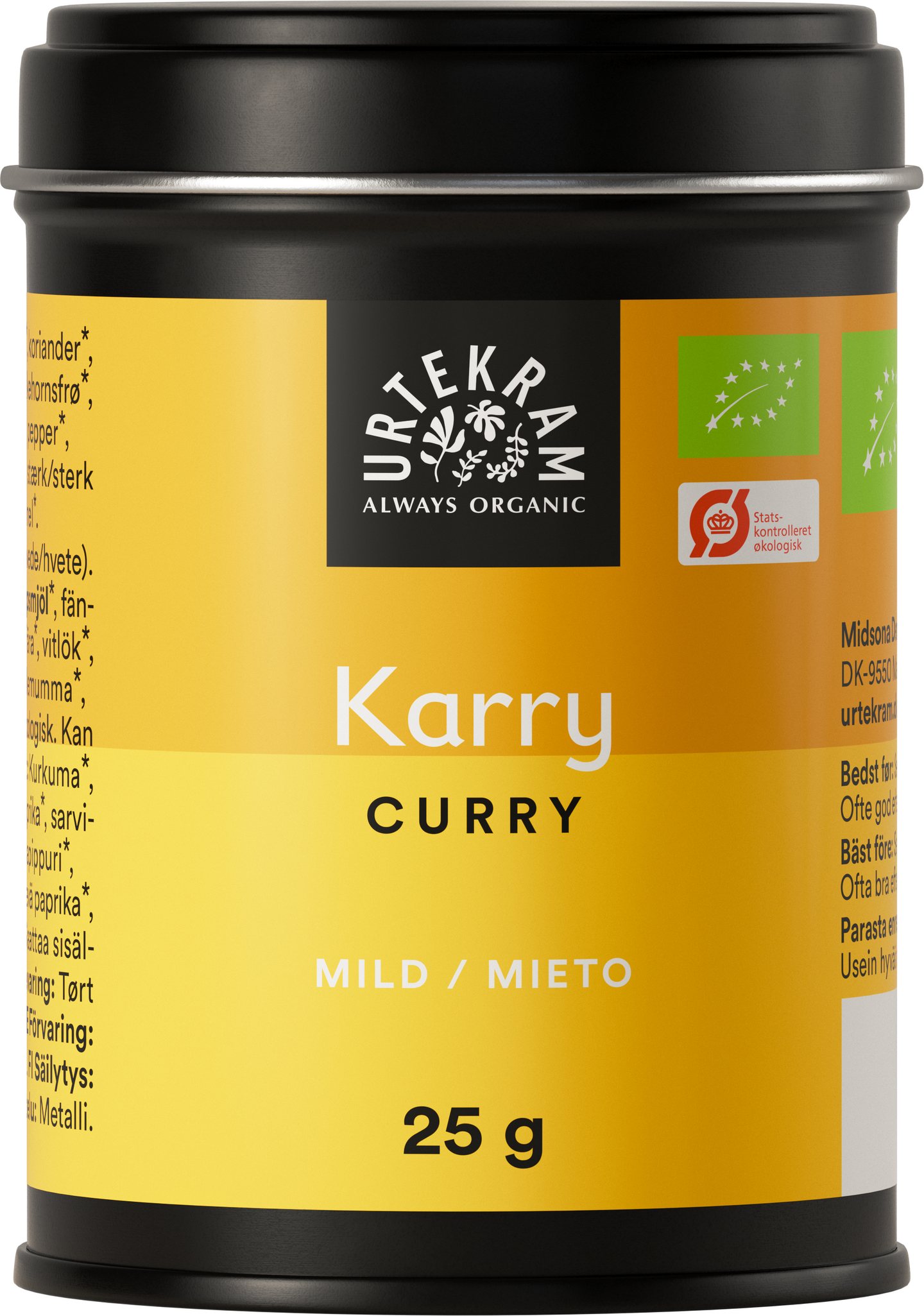 Urtekramin luomu curry on maukas ja mieto, joka on saanut inspiraation indonesialaisesta currysta. Se sisältää mm. fenkolia, inkivääriä, paprikaa, kardemummaa, muskottipähkinää ja kanelia. Yhdessä ne luovat miedon, herkullisen ja aromaattisen curryn, joka soveltuu moneen makuun. Käytä rohkeasti Urtekramin currya maustamaan tuttuja kotiruokia sekä aasialaisia kookospohjaisia kastikkeita ja wokkeja.