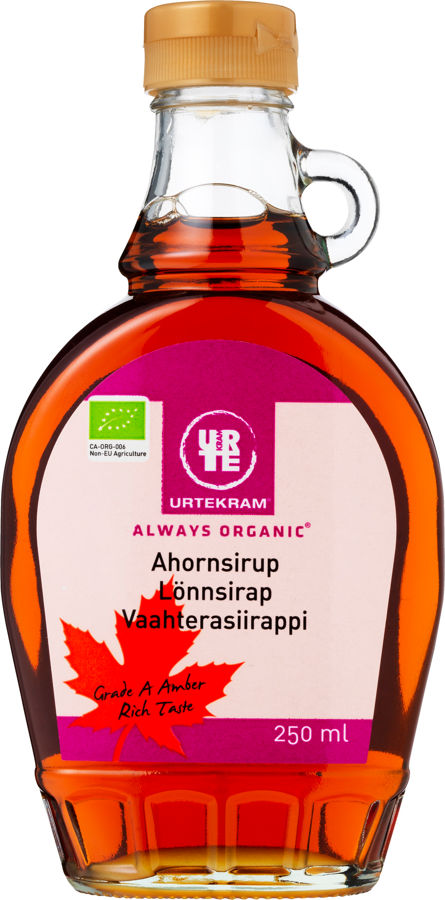 Aitoa Kanadan metsistä kerättyä vaahterasiirappia. Yhden vaahterasiirappilitran valmistukseen käytetään 40 litraa puhdasta vaahterapuun mahlaa. Sopii erinomaisesti esim. jälkiruokien ja puurojen mausteeksi tai kuumien juomien makeutusaineeksi.