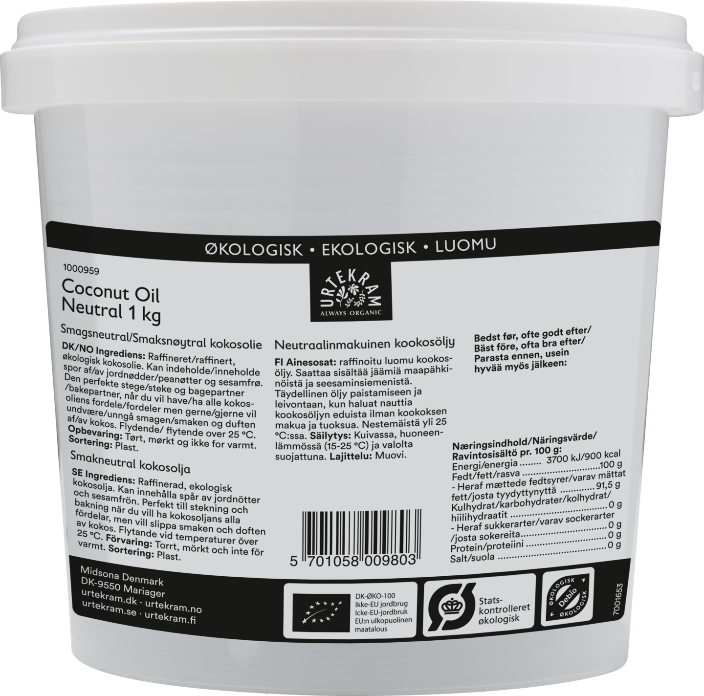 Urtekram neutraalinmakuinen kookosöljy 1kg luomu