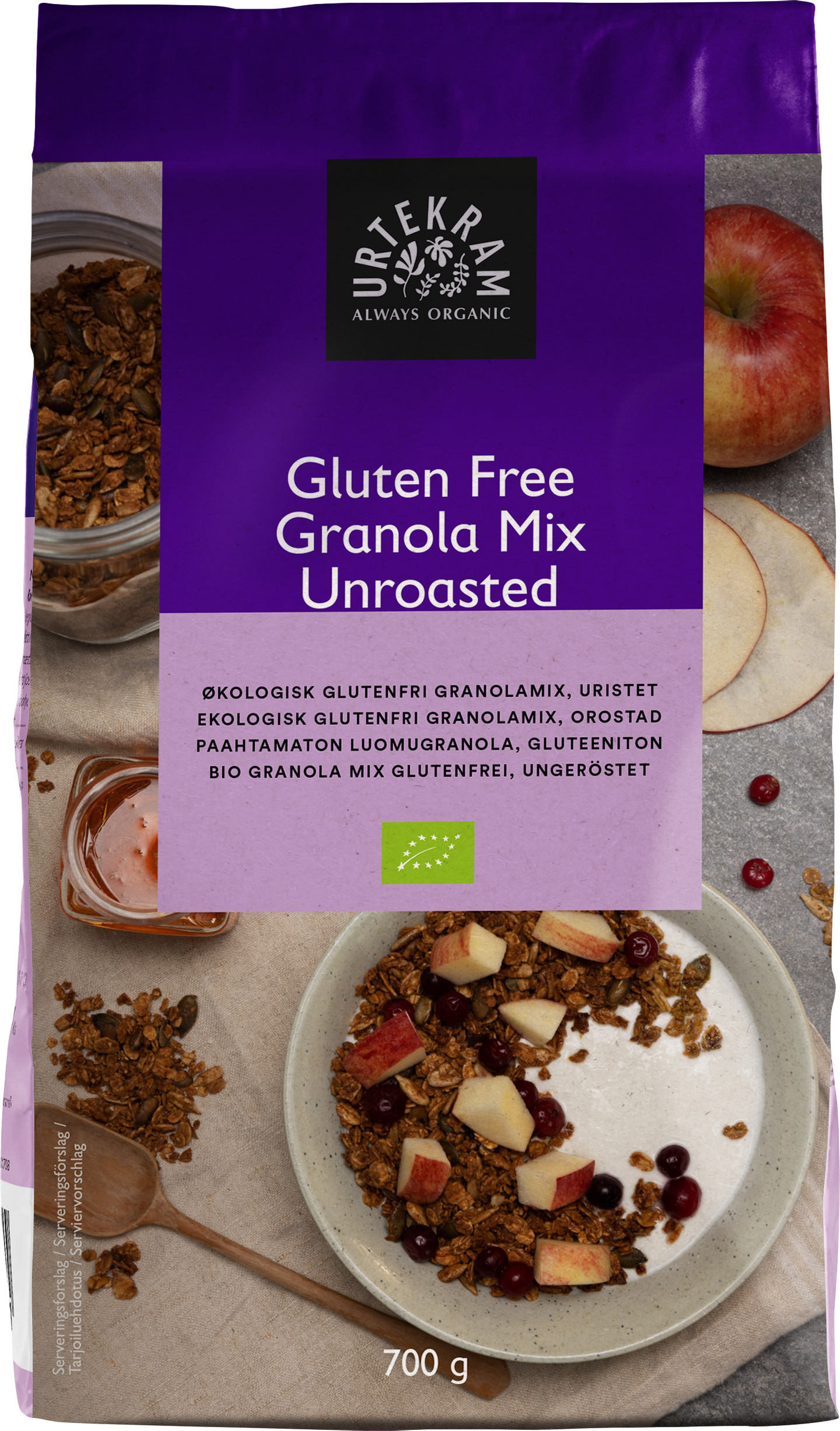 GluteenitonGranola mix, luomu, gluteeniton. Urtekram Granola Mix on paahtamaton mysliseos, josta tulee ihanan rapea ja maukas granola, kun seoksen paahtaa siirapin, omenamehun, öljyn ja mausteiden kanssa uunissa. Nauti paahdettu granola maidon, jogurtin tai rahkan kanssa. Katso valmistusohje pakkauksesta.