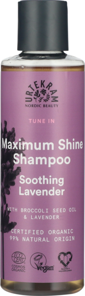 VegaaninenElvyttävä, normaaleille hiuksille sopiva Urtekram Soothing Lavender Maximum Shine shampoo sisältää laventelia ja ravitsevaa parsakaalinsiemenöljyä, jotka tekevät hiuksista pehmeät ja kiiltävät. Luomusertifioitu Ecocert Cosmos Organic -standardin mukaisesti, vegaaninen ja 100 % biohajoava sekä 100 % luonnollista alkuperää oleva koostumus.