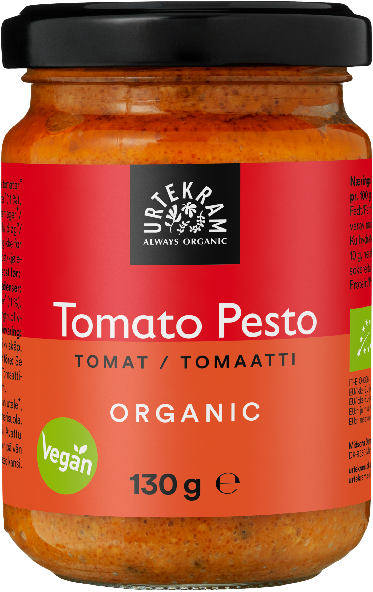 Tomaattimurska* (49 %), auringonkukkaöljy*, aurinko- kuivattu tomaatti* (12 %), CASHEWPÄHKINÄ*, basilika*, perunahiutale*, ekstra-neitsytoliiviöljy*, pinjansiemen*, valkosipuli*, merisuola. *= Luomu.