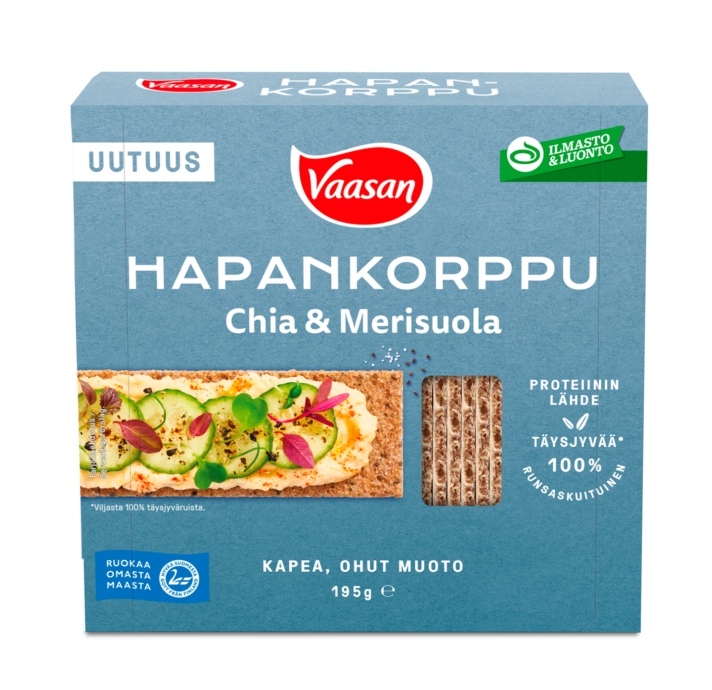 Vaasan Hapankorppu Chia & Merisuola on juureen leivottu kotimainen klassikko, johon on lisätty chiansiemeniä ja merisuolaa. Maukkaat ja rapeat hapankorput ovat leivottu 100 % täysjyvärukiista ja sisältävät runsaasti kuitua. Sopii erinomaisesti välipalaksi nälän taltuttajaksi, mutta myös juhliin tarjottavaksi sekä naposteltavaksi.