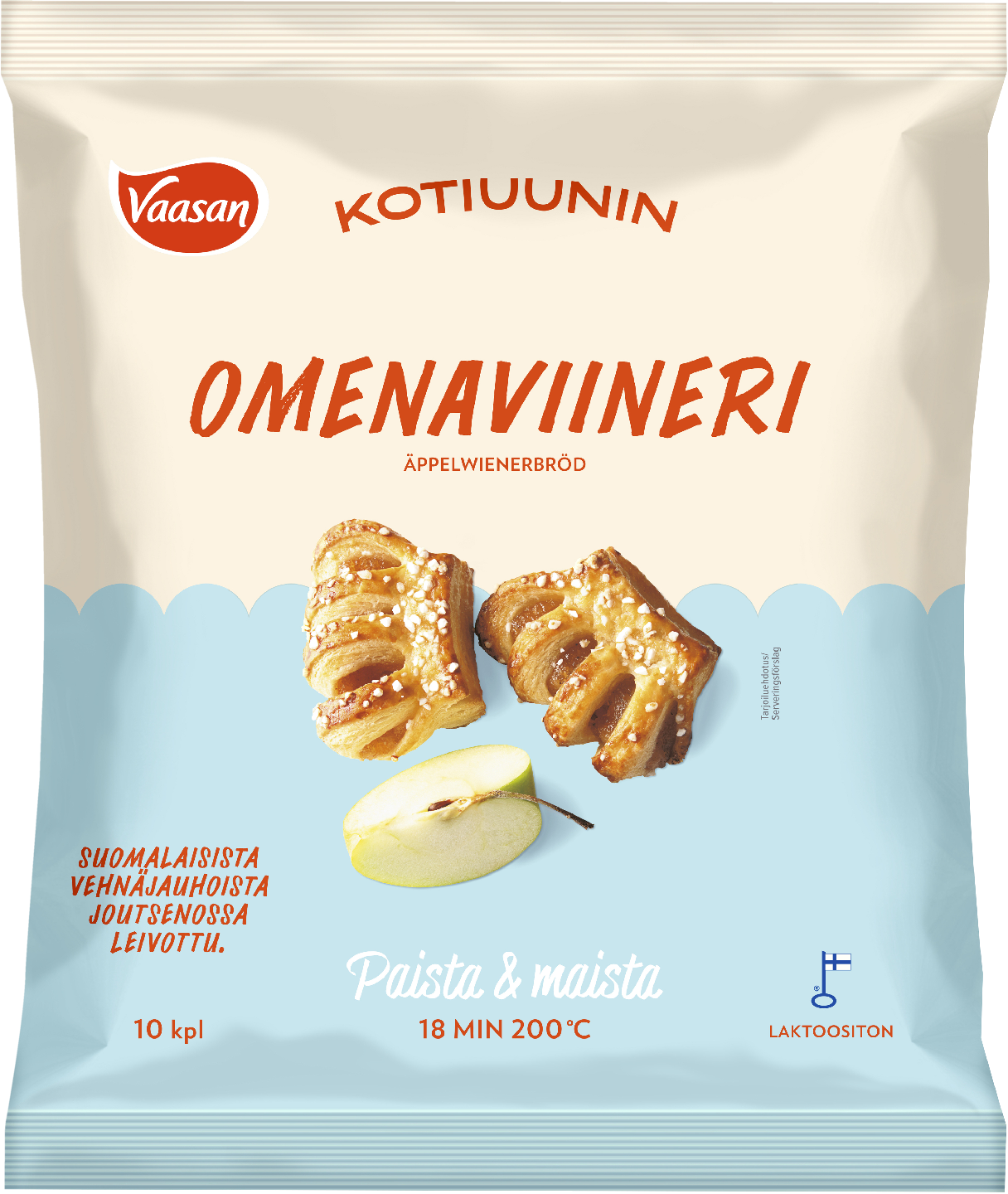 Jäisenä paistovalmis raakapakaste. Vaasan Kotiuunin Omenaviineri on klassikkoviineri, jonka sisälle on leivottu kanelista omenapalatäytettä. Leivottu Suomessa, Joutsenon leipomossamme.