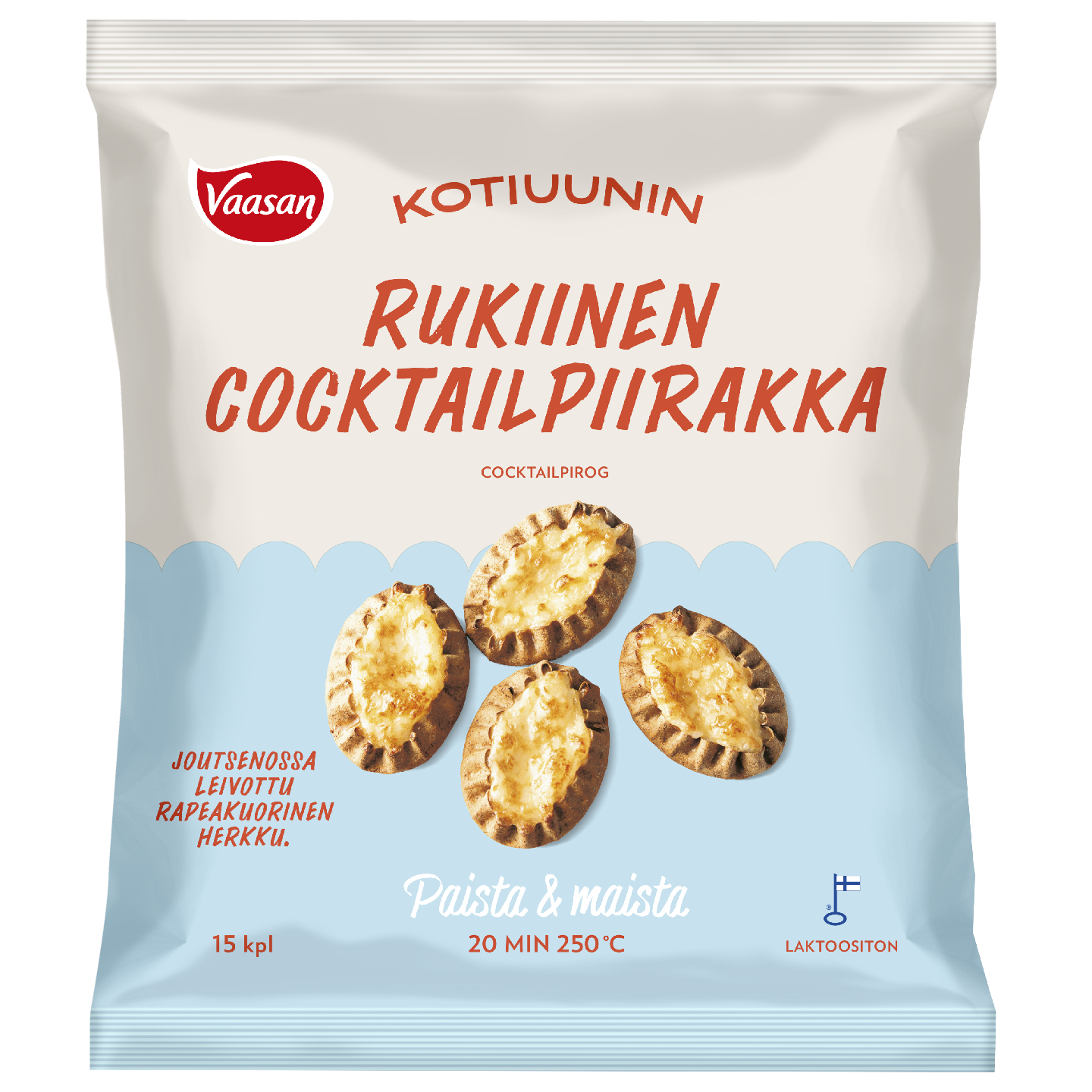 LaktoositonJäisenä paistovalmis raakapakaste. Vaasan Kotiuunin Rukiinen Cocktailpiirakka on samettisen riisipuurosydämen ja rapean ruiskuoren välinen makoisa liitto. Rakkaudella rypytettyjen piirakoiden maku tulee suoraan Joutsenon leipomostamme.