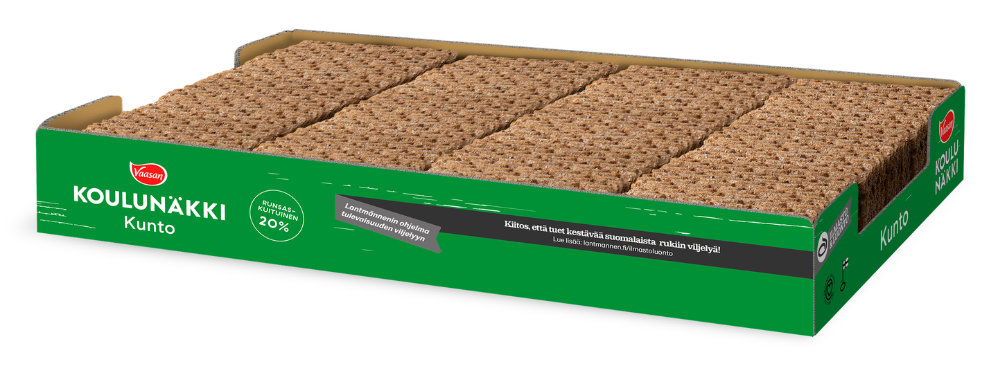 LaktoositonVaasan Koulunäkki Kunto runsaskuituinen ja leseillä kuorrutettu täysjyväruisnäkkileipä, joka on leivottu Suomessa kotimaisesta rukiista. Sopii koko perheelle. Sydänmerkkituote, runsaskuituinen. Leivontaan käytetystä viljasta 100 % täysjyväruista.