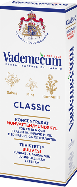 Vademecum Classic suuvesi antaa puhtaan ja raikkaan suun luonnollisilla yrteillä. Suuvesi sisältää luonnollisia uutteita salviasta, mintusta ja kamomillasta. Tuote on riittoisa ja laimennettava, sekoitussuhde 5 tippaa/1 dl vettä.