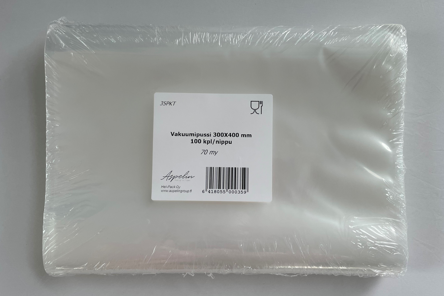 Aspelin Vakuumipussi 300x400 mm, vahvuus 70 my. Läpinäkyvä tyhjiöpussi sopii erinomaisesti elintarvikkeiden pakkaukseen ja sinetöintiin.