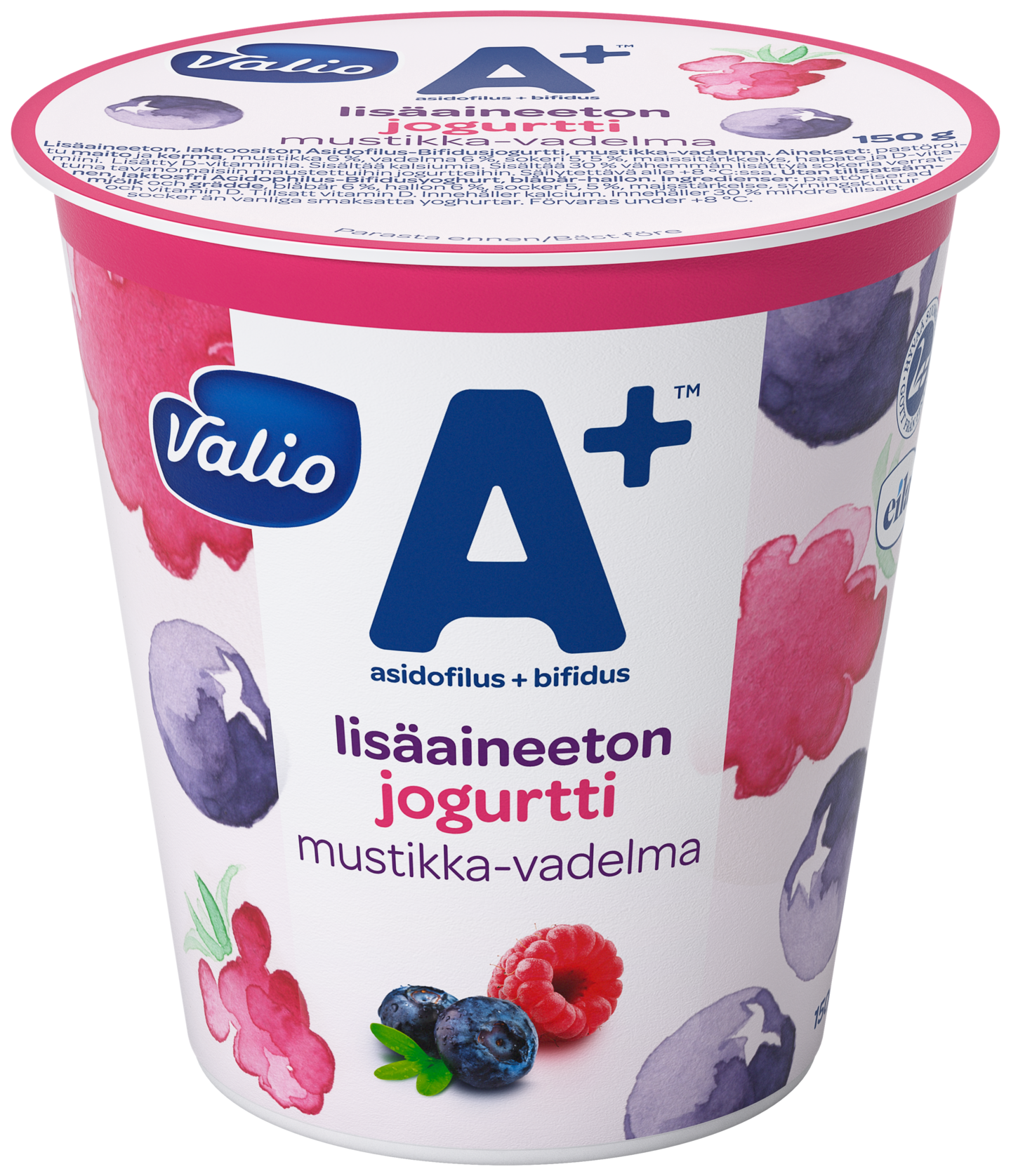 LaktoositonValio A+™ lisäaineeton jogurtti on pehmeän täyteläinen ja herkullisen marjaisa laktoositon jogurtti, joka saa makunsa mustikoista ja vadelmista. Valio A+™ jogurtit sisältävät asidofilus- ja bifidobakteereja.