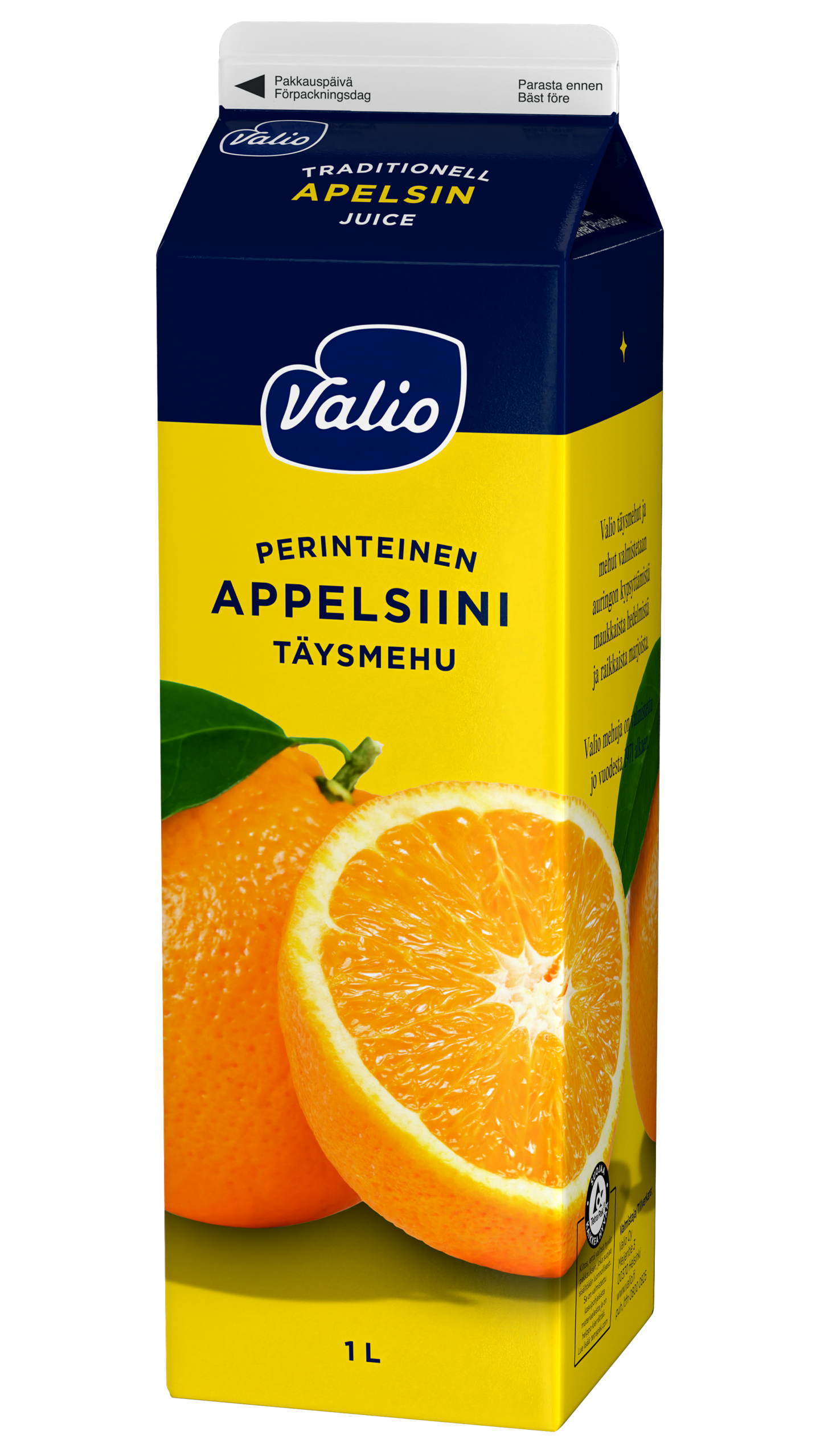 VegaaninenValio appelsiinitäysmehu on aamiaispöytien klassikko, joka maistuu koko perheelle. Täysmehujen mehupitoisuus on aina 100 %, ja appelsiinitäysmehuun on lisätty vain C-vitamiinia. Yksi dl Valio appelsiinitäysmehua sisältääkin peräti 75 % päivän C-vitamiinin saantisuosituksesta. Maista myös muita Valion täysmehuja!