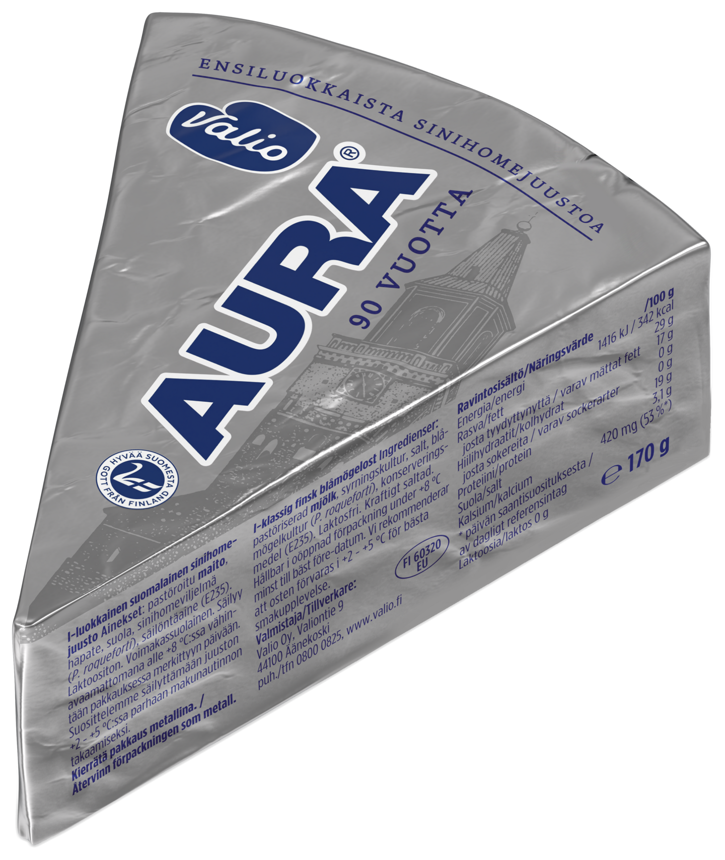 LaktoositonOn vain yksi Valio AURA®, ainutlaatuisen makuinen suomalainen sinihomejuusto, joka on maistunut herkkusuille jo vuodesta 1935. Kermaisen täyteläinen ja sopivasti suolainen Valio AURA® sinihomejuusto sopii herkutteluun sellaisenaan, leivän, keksien tai esimerkiksi ohuen ruislastun päällä. Monipuolinen sinihomejuusto antaa makua myös ruuanlaittoon. Palan lisäksi saatavilla on valmis, kätevä Valio AURA® murennettu.