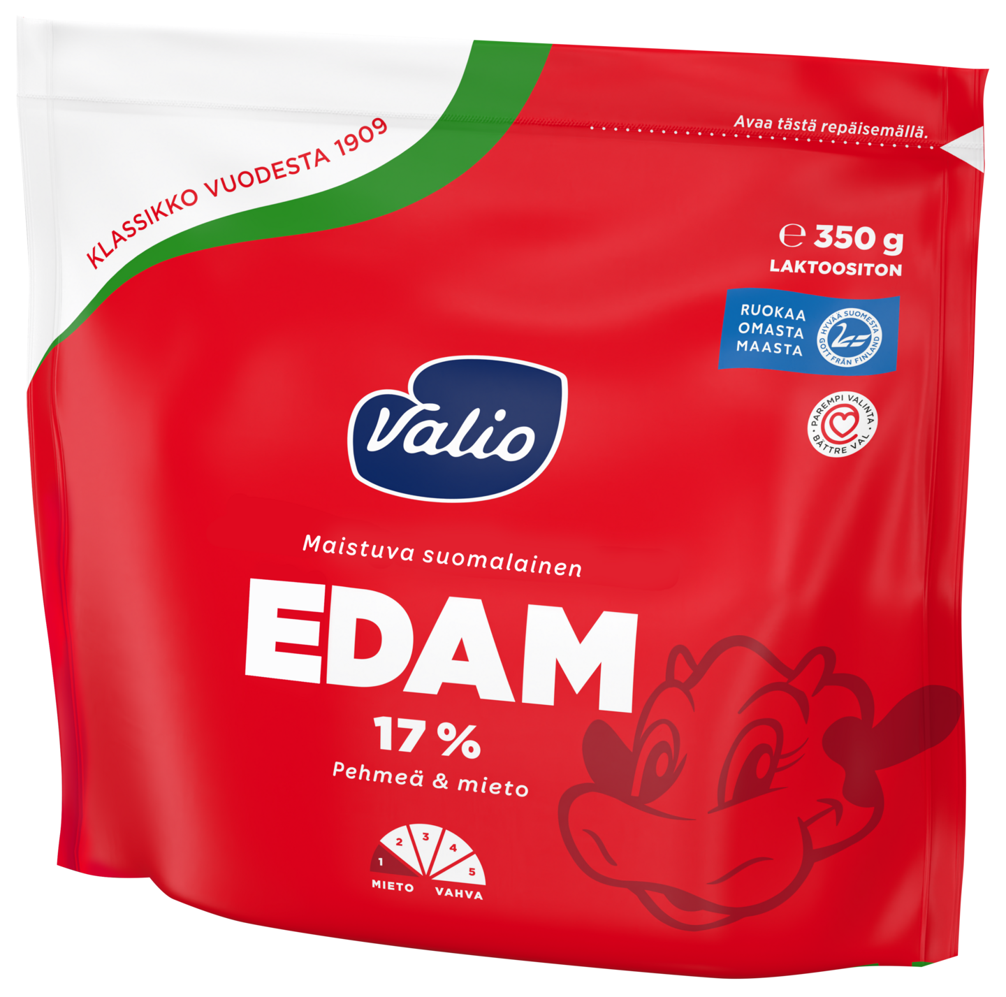 LaktoositonValio Edam 17 % on mieto ja raikas edamjuusto, joka sisältää 17 % rasvaa. Nyt uudistetussa pakkauksessa! Valio Edam 17 % on hyvä valinta koko perheen perusjuustoksi, leivän päälle tai ruuanlaittoon. Tuotteella on Suomen Sydänliiton myöntämä Sydänmerkki. Kaikki Valio Edam juustot valmistetaan suomalaisesta maidosta, ja ne ovat laktoosittomia ja säilöntäaineettomia.