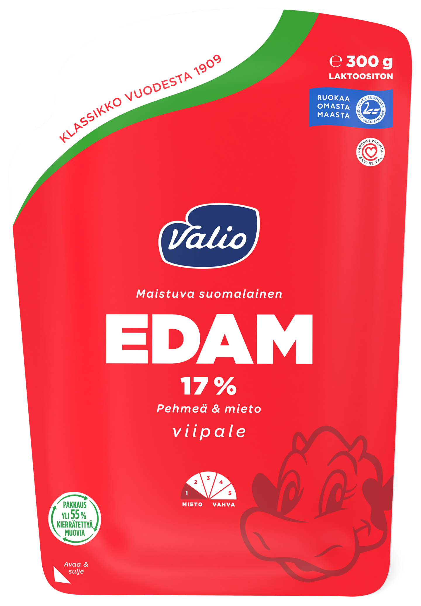 LaktoositonValio Edam 17 % on mieto ja raikas edamjuusto, joka sisältää 17 % rasvaa. Se on kevyempi valinta koko perheen perusjuustoksi, leivän päälle tai ruuanlaittoon. Tuotteella on Suomen Sydänliiton myöntämä Sydänmerkki. Kaikki Valio Edam juustot valmistetaan suomalaisesta maidosta, ja ne ovat laktoosittomia ja säilöntäaineettomia. Saatavilla palana ja viipaleina.