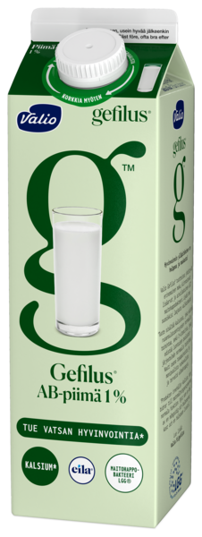 LaktoositonTue vatsan hyvinvointia! Valio Gefilus® 1 % AB-piimä on koko perheen lempeän makuinen ruoka- ja välipalajuoma. Tuote sisältää kalsiumia, joka edistää ruoansulatusentsyymien normaalia toimintaa. Tuote sisältää myös runsaasti D-vitamiinia, joka edistää luontaisen puolustusjärjestelmän normaalia toimintaa. Nauti osana tasapainoista ja monipuolista ruokavaliota ja terveitä elämäntapoja. Mukana myös LGG® maitohappobakteeri sekä asidofilus- ja bifidobakeerit.