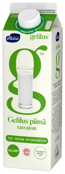 Tue vatsan hyvinvointia! Valio Gefilus® rasvaton piimä on koko perheen pehmeä ruoka- ja välipalajuoma. Tuote sisältää kalsiumia, joka edistää ruoansulatusentsyymien normaalia toimintaa. Tuote sisältää myös runsaasti D-vitamiinia, joka edistää luontaisen puolustusjärjestelmän normaalia toimintaa. Nauti osana tasapainoista ja monipuolista ruokavaliota ja terveitä elämäntapoja. Mukana myös LGG® maitohappobakteeri.