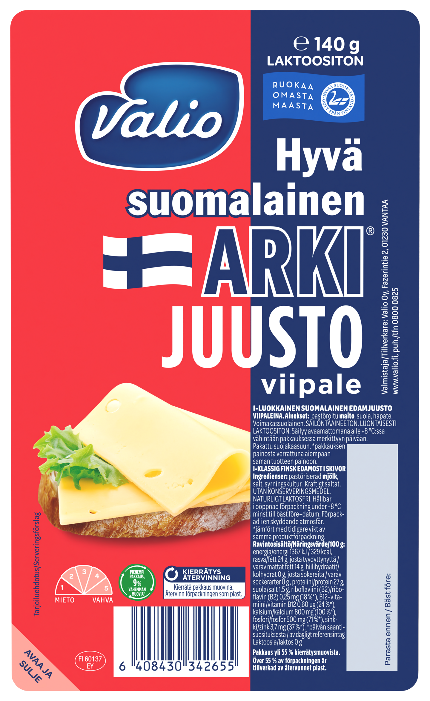 LaktoositonHyvä suomalainen Arki® juusto on mukavan mieto edam-tyylinen juusto, joka maistuu arjessa leivän päällä koko perheelle. Nyt saatavilla myös kätevinä viipaleina. Tuotesarjan juustot ovat laktoosittomia ja säilöntäaineettomia, ja ne valmistetaan Suomessa kotimaisesta maidosta.