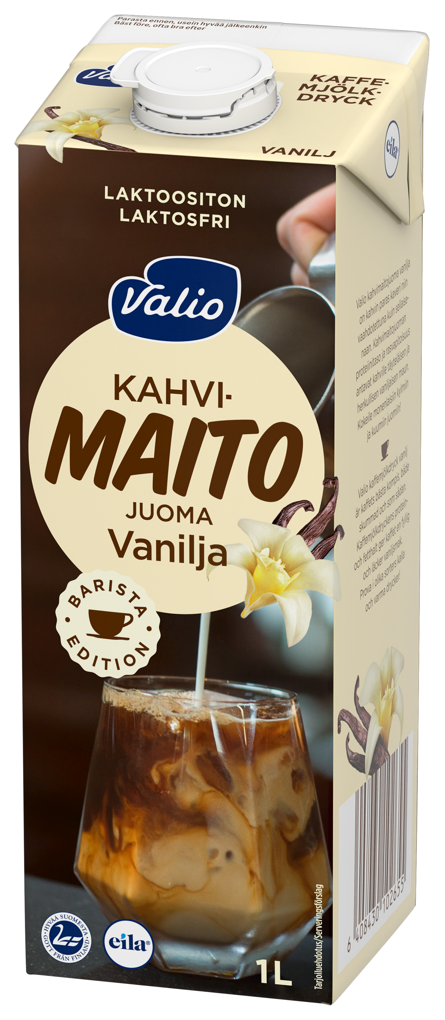 LaktoositonTervetuloa vaniljaiset kahvihetket! Valio kahvimaitojuoma vanilja on kahvin paras kaveri niin vaahdotettuna kuin sellaisenaan. Valio kahvimaidot on kehitetty yhdessä kahviasiantuntijoiden kanssa. Niiden proteiinitaso ja rasvapitoisuus antavat kahville täyteläisen ja herkullisen maun. Laktoositon kahvimaitojuoma myös vaahtoutuu kauniisti ja valkaisee kahvia juuri sopivasti. Kokeile monenlaisiin kylmiin ja kuumiin juomiin!