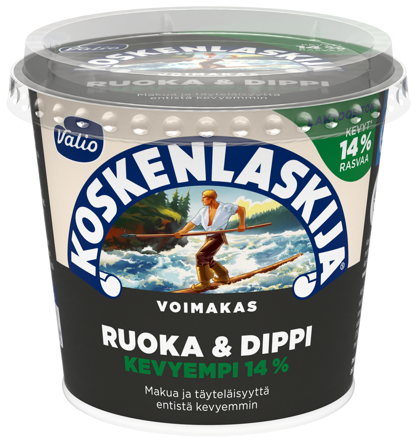 LaktoositonValio Koskenlaskija® Ruoka & Dippi on nyt kevyt mutta voimakas. Valio Koskenlaskija® Ruoka & Dippi voimakas 14 % on juustokastike, joka maistuu herkulliselta kylmänä tai kuumana. Se antaa reilusti juustoista makua ja suussasulavaa täyteläisyyttä, mihin ikinä sitä käytätkään! Dippaa, mausta, mehevöitä tai kuorruta kevyemmin. Kokeile myös keittoihin, pastakastikkeeseen tai hampurilaisen väliin. Valio Koskenlaskija® Ruoka & Dippi voimakas 14 % sopii aivan erityisen hyvin uuniruokiin kuten munattomaan makaronilaatikkoon.