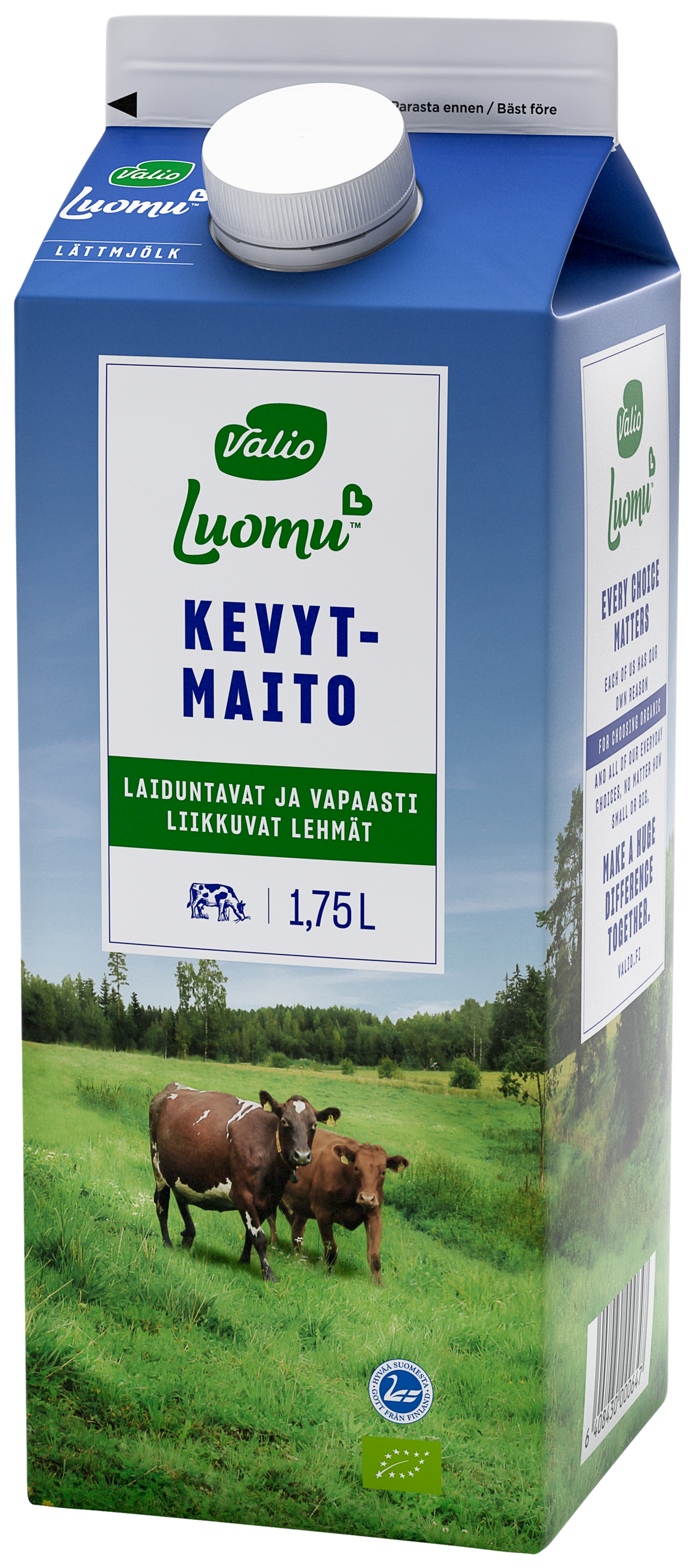 Valio Luomu™ kevytmaito tulee tiloilta, joissa lehmät saavat liikkua, mennä syömään ja levätä vapaasti omaan tahtiinsa pihattonavetassa ja ovat laitumella koko kesän. Nauti raikkaan ja lempeän makuista luomumaitoa sellaisenaan tai käytä leivonnassa ja ruoanlaitossa. Valio luomukevytmaitoa ei homogenoida, joten pieni ravistus on paikallaan ennen käyttöä. Valio Luomu™ on kestävä valinta luonnon monimuotoisuuden puolesta. Tutustu myös muihin Valio Luomu™ tuotteisiin!
