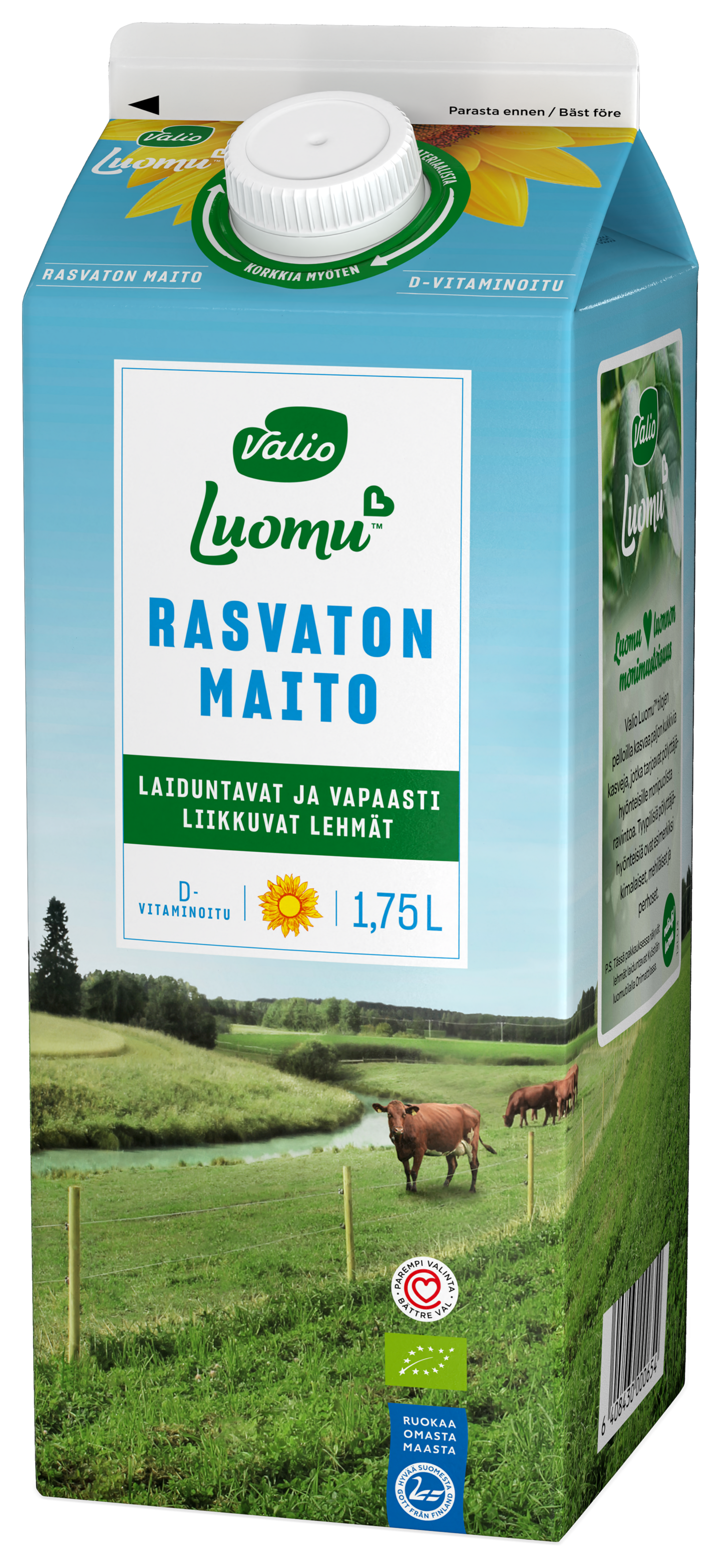 Valio Luomu™ D-vitaminoitu rasvaton maito tulee tiloilta, joissa lehmät saavat liikkua, mennä syömään ja levätä vapaasti omaan tahtiinsa pihattonavetassa ja ovat laitumella koko kesän. Siihen on lisätty D-vitamiinia saman verran kuin tavalliseen Valion rasvattomaan maitoon. Tunnistat tuotteen pakkauksen auringonkukasta. Nauti sellaisenaan tai käytä leivonnassa ja ruoanlaitossa. Valio Luomu™ on kestävä valinta luonnon monimuotoisuuden puolesta. Tutustu myös muihin Valio Luomu™ tuotteisiin!