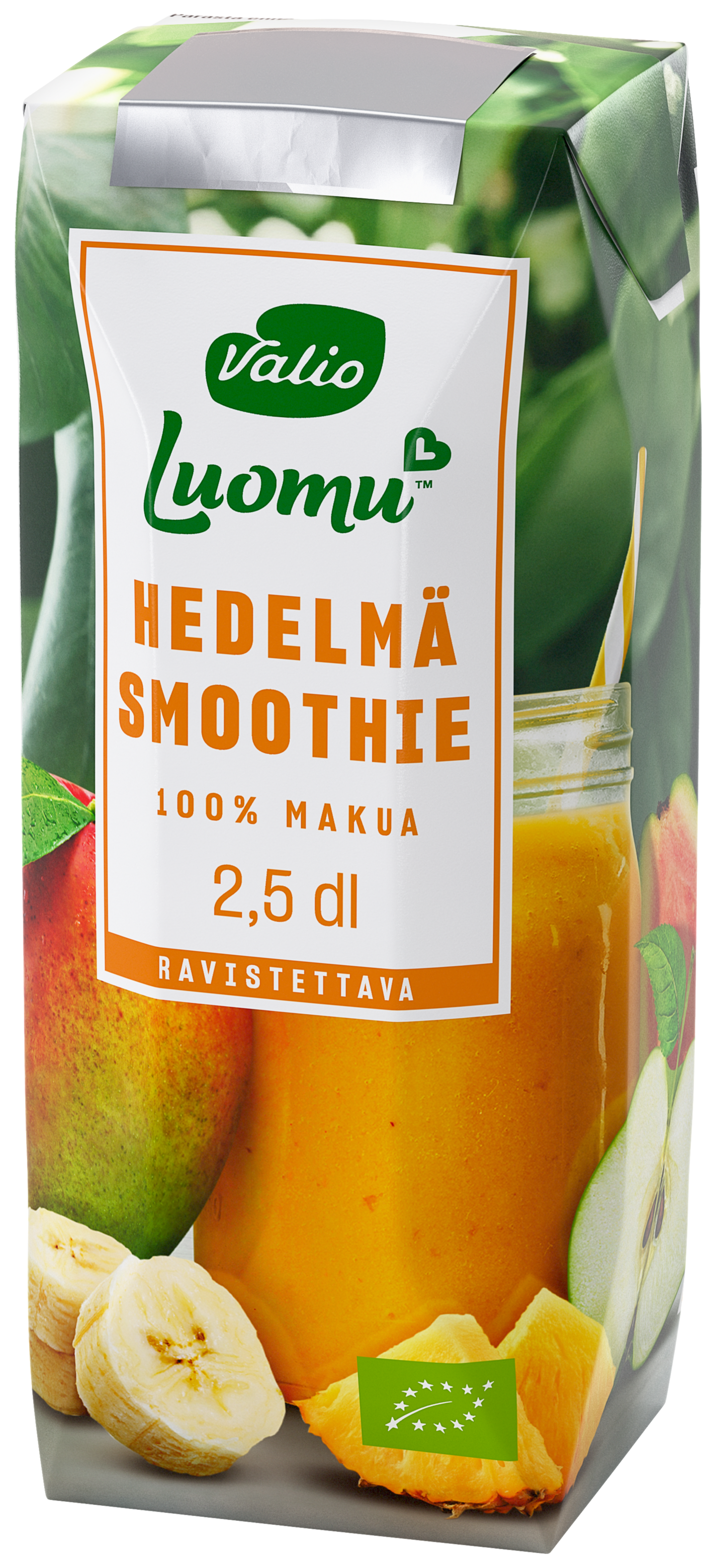 VegaaninenValio Luomu™ hedelmäsmoothie on raikas välipalajuoma luomuhedelmistä: se on herkullinen sekoitus omenaa, mangoa, ananasta, banaania, guavaa ja sitruunaa. Niiden luontainen makeus riittää tähän raikkaaseen juotavaan välipalaan. Valio Luomu™ smoothiet valmistetaan luomumarjoista ja -hedelmistä ilman lisättyä sokeria. Hedelmäpitoisuus 100 %. Valio Luomu™ on kestävä valinta luonnon monimuotoisuuden puolesta. Tutustu myös muihin Valio Luomu™ tuotteisiin!